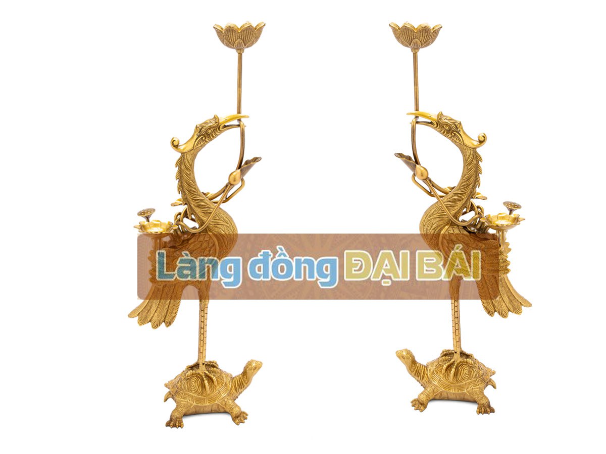Đôi hạc Đồng - Đôi hạc đứng trên lưng rùa:  Sản phẩm hạc đứng trên lưng rùa thành một cặp là sự kết hợp hài hòa, gắn kết giữa trời và đất, giữa hai thái cực âm dương, thanh cao và trường tồn, giúp gia tiên ngày càng ấm no, hạnh phúc.Hạc là loài chim quý trên trời, hình ảnh chim hạc thường được gắn liền với các vị thần tiên, tượng trưng cho sự trường thọ, khát vọng của sự trường tồn. Rùa là linh vật sống trên mặt đất, trong văn hóa người Việt, rùa là biểu tượng của sự trường thọ, sự che chở, hỗ trợ (Rùa được nhắc đến trong tích Vua Lê mượn Gươm rùa thần).